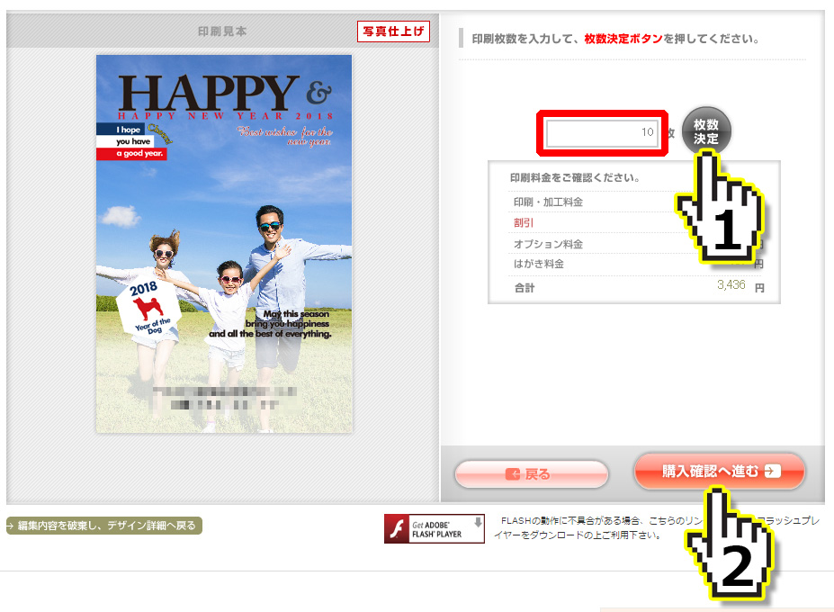 枚数を入力して「枚数決定」ボタンをクリックすると印刷料金が表示されます。