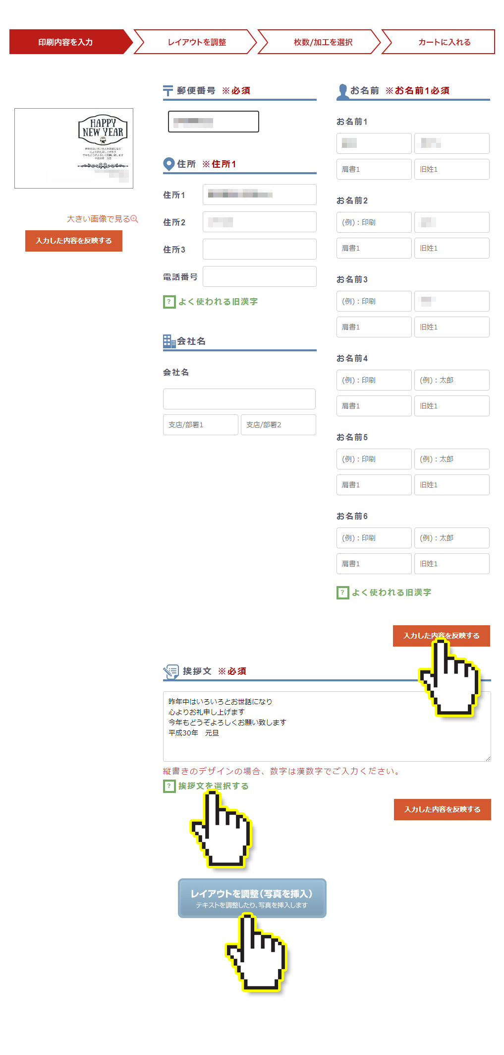 郵便番号、差出人住所、名前等を入力します。「入力した内容を反映する」ボタンをクリックすると左上のプレビュー画面に反映されます。