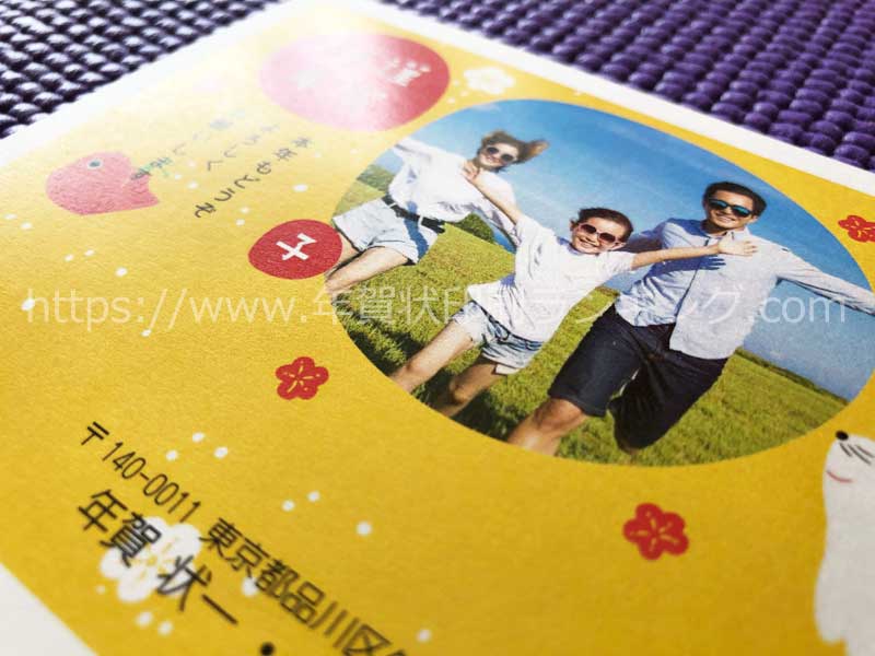 印刷仕上げの写真年賀状なので、印画紙に印刷されたものを貼り合わせしたタイプでは無く、年賀状に直接印刷されてるタイプですが、写真も十分満足できるレベルです。周りのベタ塗の部分もキレイに印刷されています。
